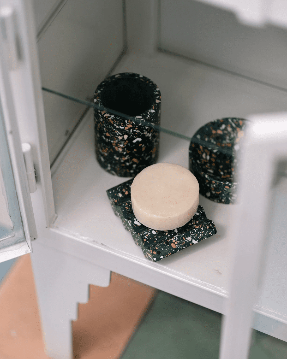 Alkaline’s signature material is Jesmonite. It’s a lightweight, eco-friendly composite that looks like stone and behaves like clay. Everything is cast, pigmented, and finished in-house, giving each object its own quiet identity.